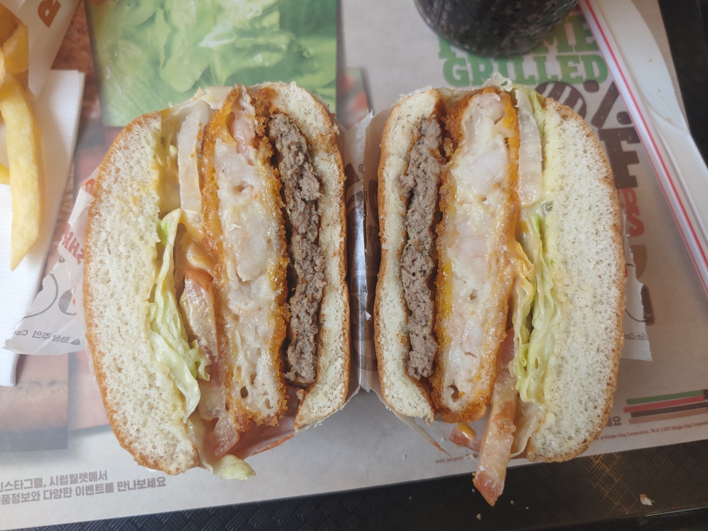 버거킹 아빠상어버거의 특징은 새우튀김패티와 비프패티가 들어가있다는 것 입니다.