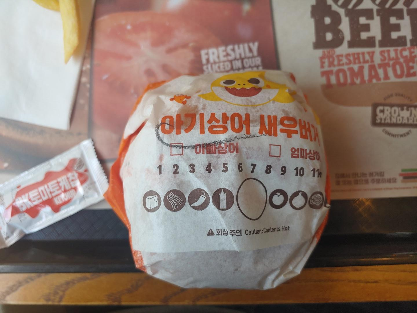 제가 오랫동안 일했던 롯데리아의 새우버거엔 새우튀김 패티만 들어있는데, 아빠상어버거엔 둘다 들어있는거죠.