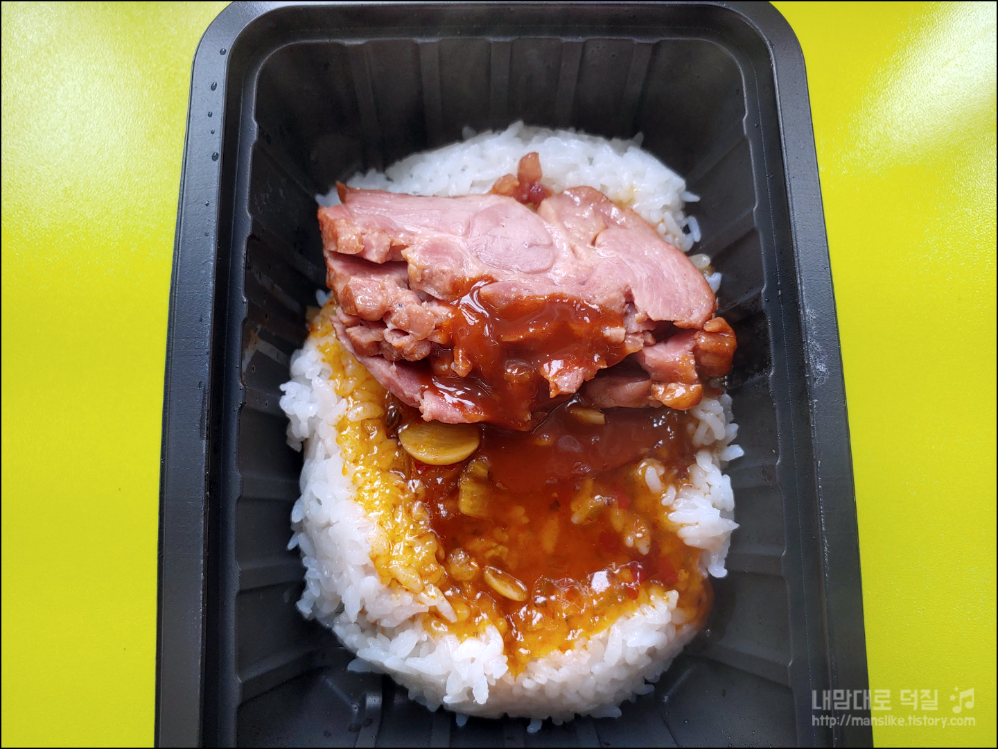 밥과 소스 그리고 훈제오리를 순서대로 넣고 전자렌지에 넣고 돌린후 더덕고추장소스를 넣고 먹으라는데...
