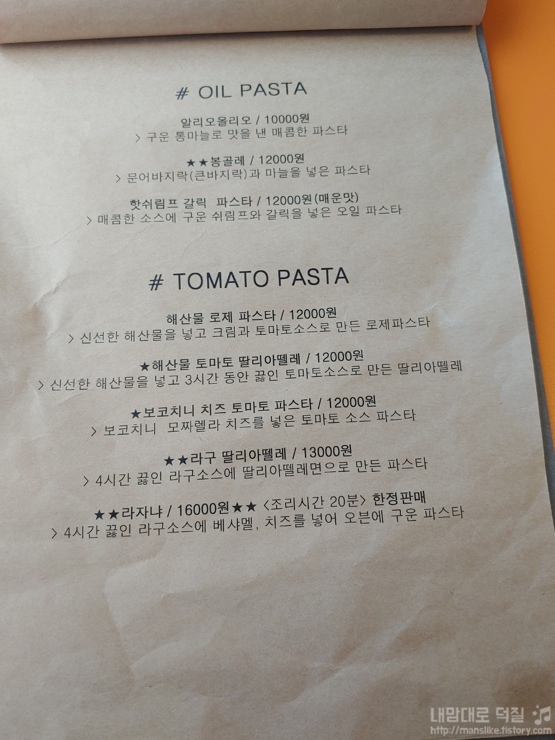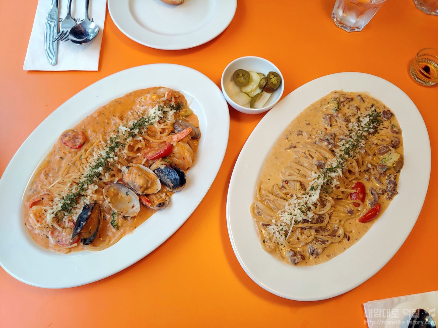저는 소불고기 크림 파스타(14,000원)와 해산물 로제 파스타(12,000원)를 주문했습니다.